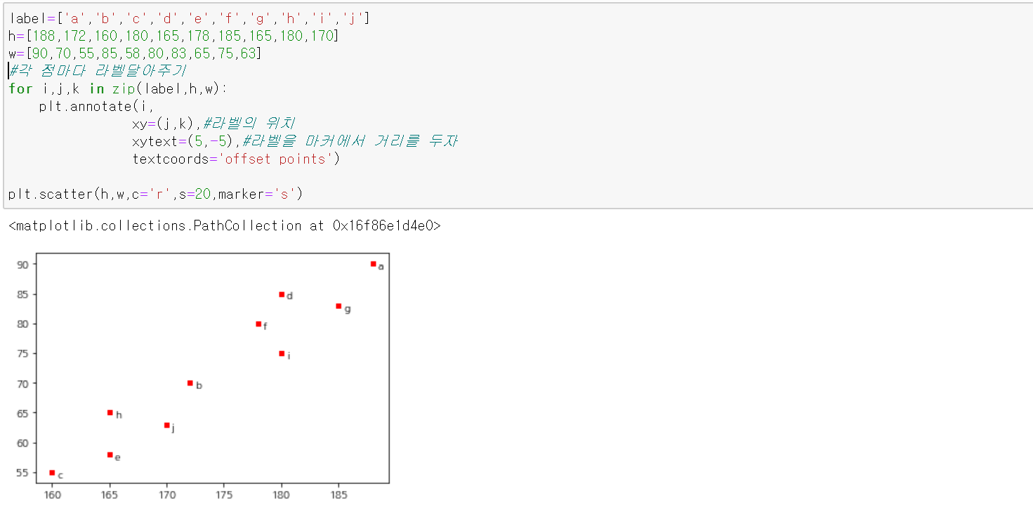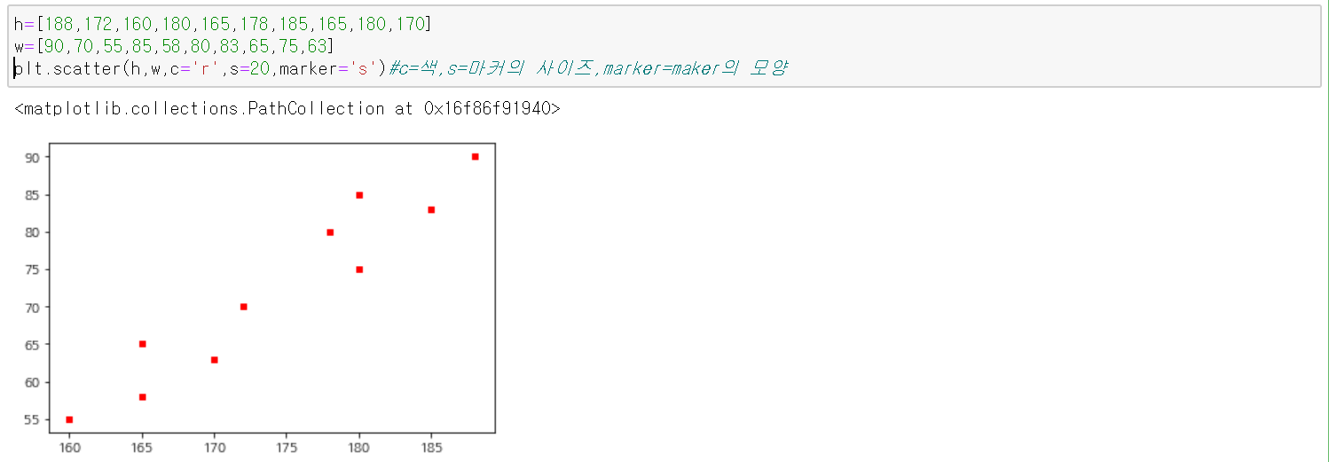 아래 코드는 어떤 그룹의 사람들의 키와 몸무게를 산점도로 시각화한 것이다.