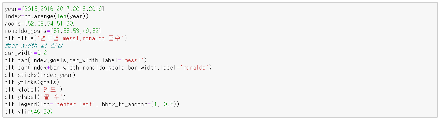 선 그래프처럼 막대그래프도 동시에 여러 개의 막대를 그릴 수 있다. 이때 중요한 점은 첫 번째 이후에 막대에는 bar_width 이용하여 bar_width만큼 떨어지게 설정을 해줘야 한다.