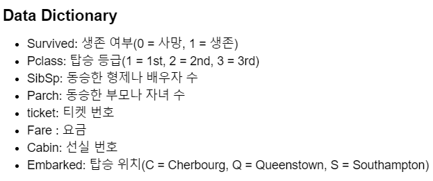 여기서는, "Titanic: Machine Learning from Disaster"에 대한 주제로 머신러닝을 활용해서 타이타닉 호에서 생존한 승객을 예측하려 한다. Train Set로 학습을 시켜 Test Set에 적용해 결과를 도출할 것이다. 즉, 승객의 생존 여부를 포함한 세부 정보가 담긴 Train Set으로 승객의 생존 여부가 포함되지 않은 Test Set에 담긴 승객의 생존을 파악하는 것이 목표다. 세부 개요와 데이터는 아래 사이트에서 확인할 수 있다.