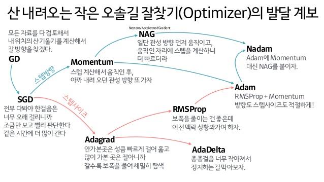 - Adam : RMSProp와 Momentum을 합친 알고리즘이다. 일단 잘 모르겠으면 Adam을 사용하라고 하자.