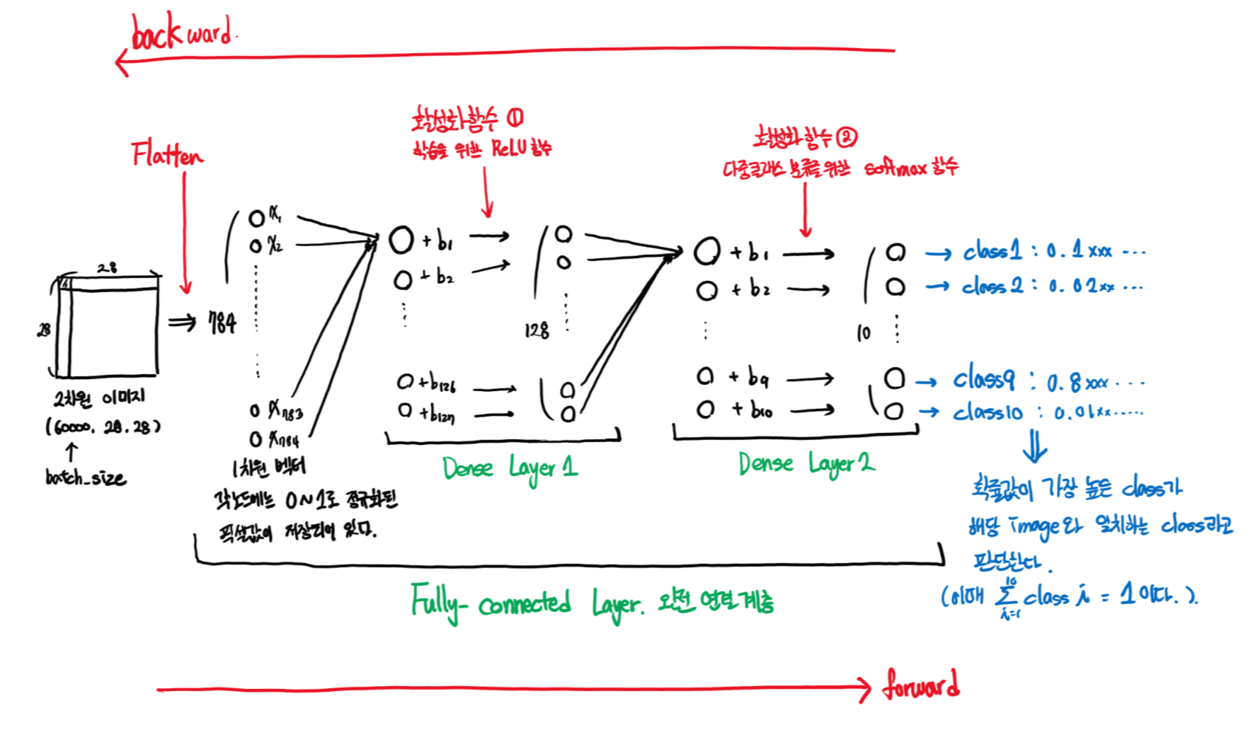 그럼 이렇게 구한 손실값을 써먹을 때가 왔다. 앞서 Fully connected Layer로 모델 구성을 통해 각 이미지가 어떻게 분류됐는지 쭉 계산해 왔다. 이것을 순전파라고 한다. 말 그대로 층을 거쳐가면서 앞쪽으로 Input값을 보내는 과정이다. 하지만 한 번 학습했다고 그 출력 값이 정확하지는 않을 것이다. 그러기 위해 우리는 그 출력 값과 실제값이 얼마나 차이가 나는지 계산했다. 그러면 그 손실값을 다시 앞으로 보내 출력 값이 정확하게 나오도록 각각의 Layer의 노드들의 가중치와 편향(bias)을 업데이트해주는 과정을 오차역전파라고 한다.