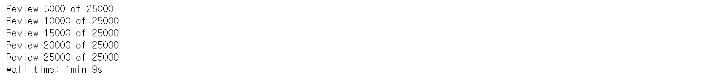 먼저 이전 단계에서 만든 review_to_words 함수를 이용해 모든 trian,test의 리뷰들을 정제해주자. 조금 시간이 걸린다.