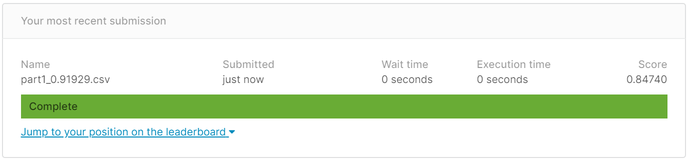 필자같은 경우는 첫번째 제출때 실수로 캡쳐를 못해 다시 제출해서 wait time이 0초인데 원래는 평가하는데 시간이 좀 걸린다. 점수는 0.84740이 나온 모습이다.