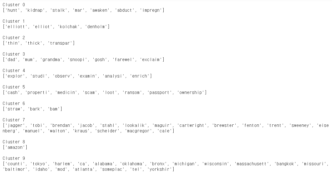 이제 우리는 클러스터를 만들었고 이 클러스터의 어떤 단어들이 포함되어있는지 알 수 있다. 이때 클러스터를 만들때